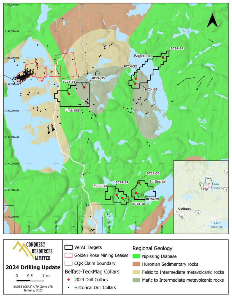 Thomas Obradovich, Conquest’s President and CEO, commented, “We are excited to see the results of our first AI-driven exploration partnership with VerAI on our Belfast-TeckMag Project, and in particular, intercepting copper – zinc – gold mineralization at Eaglerock. The results from drillhole BC24-32 are of particular interest when you consider that this was one of only three holes testing a completely concealed AI target that is up to 2 km long and 500 m wide, and where we were not able to detect mineralization using traditional exploration techniques. The fact that we see intervals of anomalous copper, zinc, and gold up to 30 m wide with separate zones enriched in palladium and platinum, bodes well for the potential discovery of a significant mineralized system at Eaglerock with the next stage of drilling.”