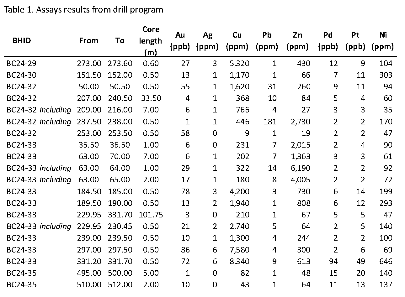 On the 2 km long Eaglerock target, two of three drillholes (BC24-32 and BC24-33) intersected sulphidic horizons including chalcopyrite and sphalerite, within dominant pyrrhotite mineralization locally amounting up to 25%. Assay results have confirmed visual observations with significant copper mineralization being intersected including 0.83% Cu over 0.50 m in drillhole BC24-33, along with anomalous Cu mineralization over a core length of 33.50 m in drill hole BC24-32. Coinciding Zn mineralization has also been confirmed including 0.40% Zn over 2.00 m in drill hole BC24-33 within a zone of 7m averaging >0.1% Zn.
