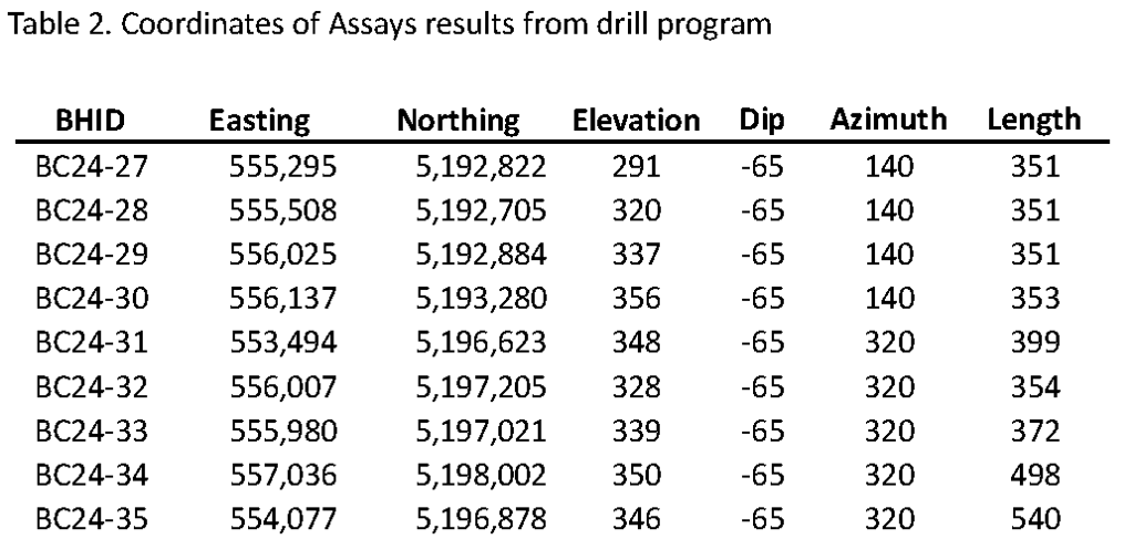 Two 350 m holes (BC24-27 and BC24-28) were drilled at the Manitou target but failed to reach the target horizon beneath thick Nipissing diabase units. Due to the thickness of cover sequences in the area, potential exists at greater depths to intercept the target unit with further drilling.