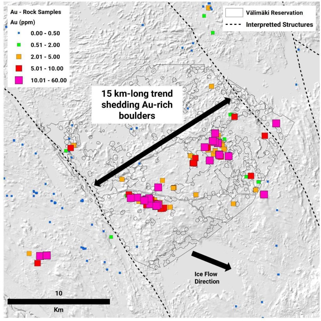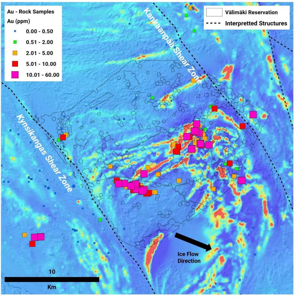 Many of the auriferous boulders were discovered by local prospectors and analyzed through GTK’s Citizen’s Sampling Program (GTK Mineral Deposit Report Valimaki https://tupa.gtk.fi/karttasovellus/mdae/raportti/450_V%C3%A4lim%C3%A4ki.pdf) where local prospectors can send samples to GTK for analysis and receive a reward if they lead to a new exploration target.