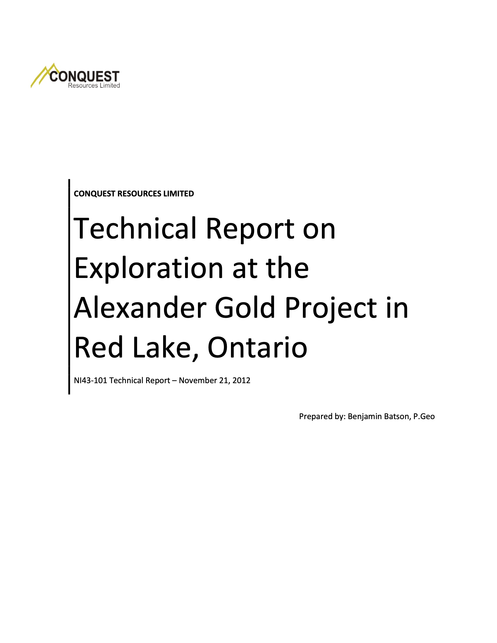 - Since the acquisition of the Alexander Gold Property in 2002, Conquest has completed a total of 31,086 metres of surface exploration diamond drilling in 55 drill holes between 2003 through to 2011.