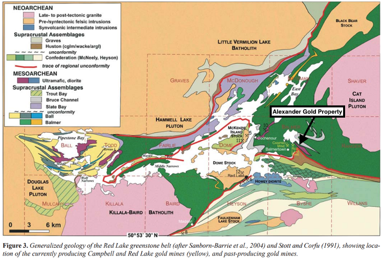 - The Alexander Gold Property comprises 27 patented mining claims covering 448 hectares (1,107 acres) adjoining Evolution Mining’s Red Lake-Campbell Complex. Our target on the Alexander Gold Property is an extension, or repetition, of the mineralization at the Red Lake Gold Mine.