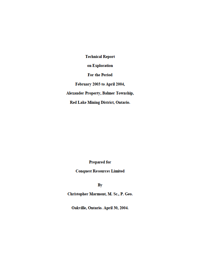 - An additional 2,073 metres of drilling comprising 7 drill holes were completed during Winter 2004, the results of which are discussed in a Technical Report entitled “Technical Report on Exploration at the Alexander Gold Project in Red Lake, Ontario” dated November 21, 2012 (See Below).
